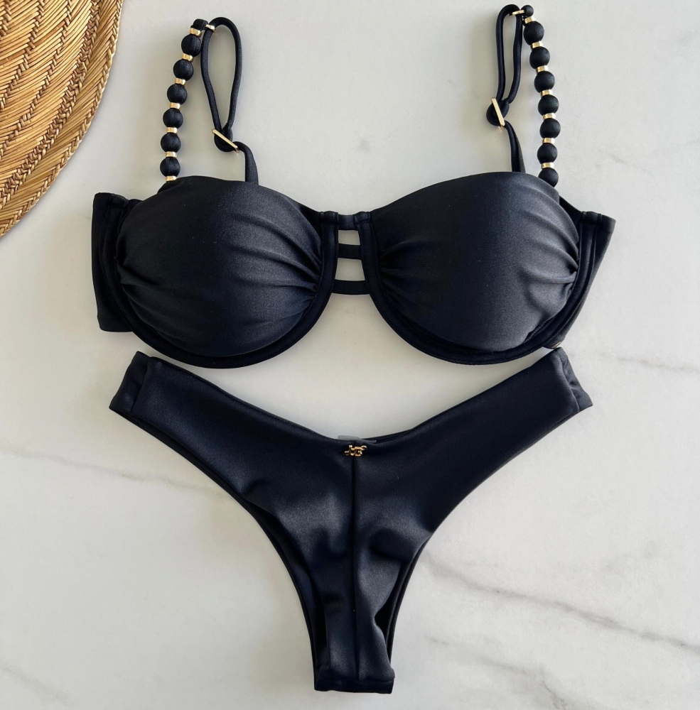 *Confeccionado em trilobal beach. *Meia taça com aro que proporciona encaixe e sustentação ao seio. *Alças trabalhadas em metais e pérolas. *Calcinha asa delta com bumbum fio duplo. *Bojo removível e metais banhados. *Peças em tons neon não possuem trocas.