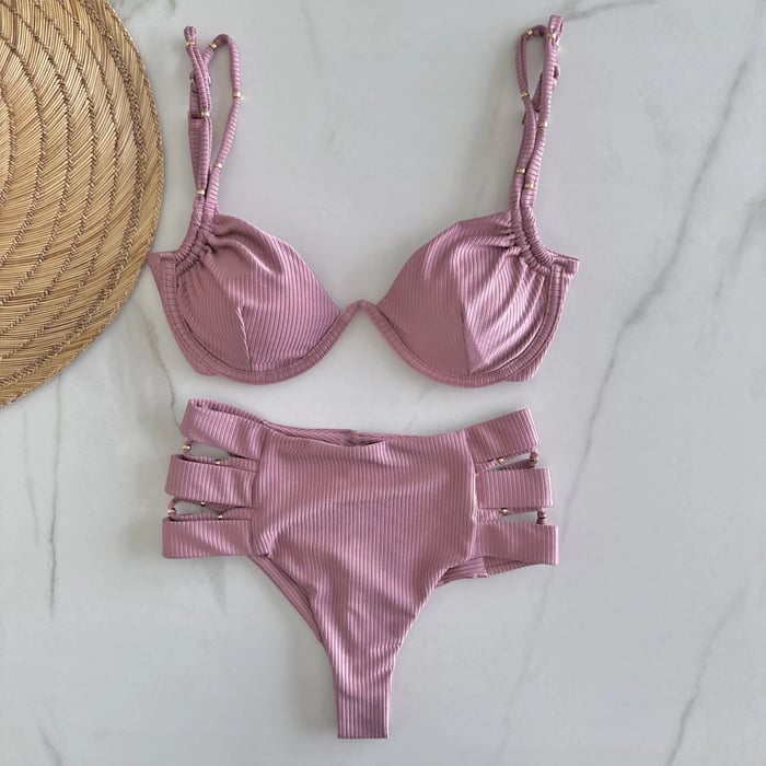 *Confeccionado em suplex canelado acetinado de alta resistência. *Meia taça com aro inteiro que proporciona encaixe e sustentação ao seio. *Laterais ajustáveis e alças frontais duplas trabalhadas em metais. *Calcinha hot pant de tiras laterais e bumbum fio duplo. *Possui bojo removível, reguladores nas alças e metais banhados. *Peças em tons neon não possuem trocas.
