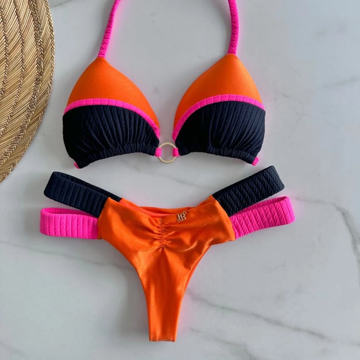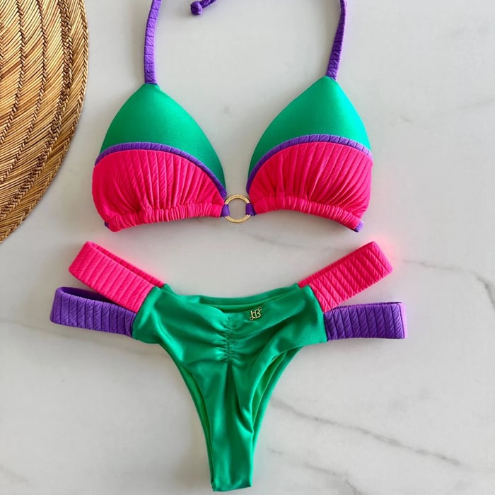 *Confeccionado em suplex canelado e trilobal beach. *Tecnologia Uv50+, Highclo e Dry que garante a durabilidade da peça 3x mais que um suplex comum. *Detalhe em debrum e argola central. *Bojo removível, alças com elástico e metais banhados. *Calcinha com tiras laterais e empina bumbum. *Peças em tons neon não possuem trocas.