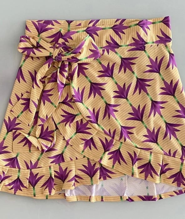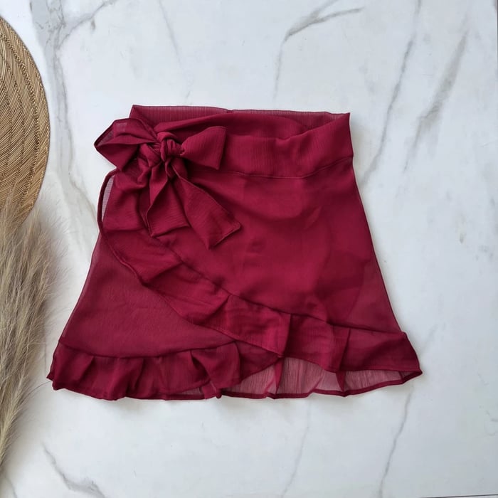 *Confeccionada em fluit. (estampada) *Confeccionada em crepe shiffon. (marsala) *Saia curta com cós transpassado.